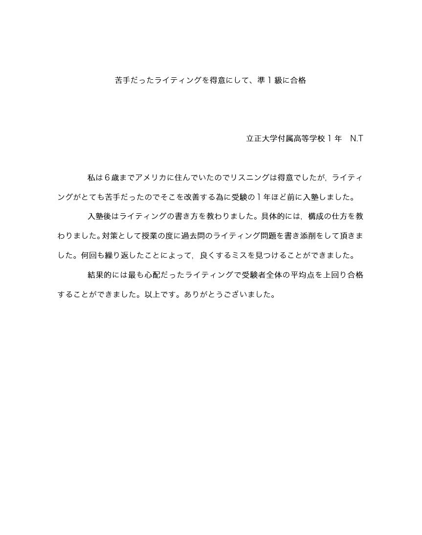 苦手だったライティングを得意にして、英検準1級合格立正大学付属高等学校1年 N.T 私は6歳までアメリカに住んでいたのでリスニングは得意でしたが、ライティングがとても苦手だったのでそこを改善する為に受験の1年ほど前に入塾しました。 入塾後はライティングの書き方を教わりました。具体的には,構成の仕方を教わりました。対策として授業の度に過去問のライティング問題を書き添削をして頂きました。何回も繰り返したことによって、良くするミスを見つけることができました。 結果的には最も心配だったライティングで受験者全体の平均点を上回り合格することができました。以上です。ありがとうございました。